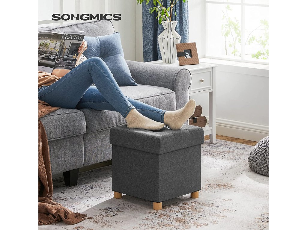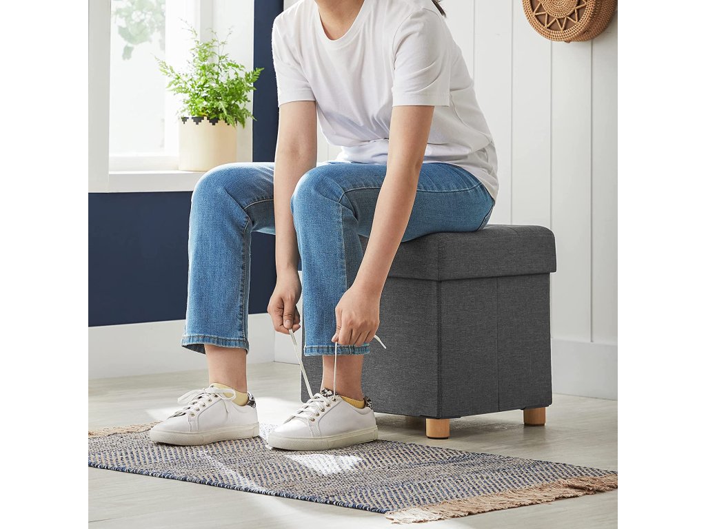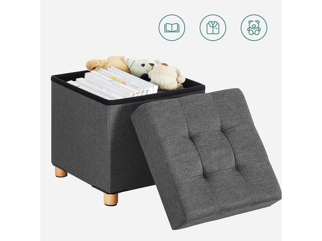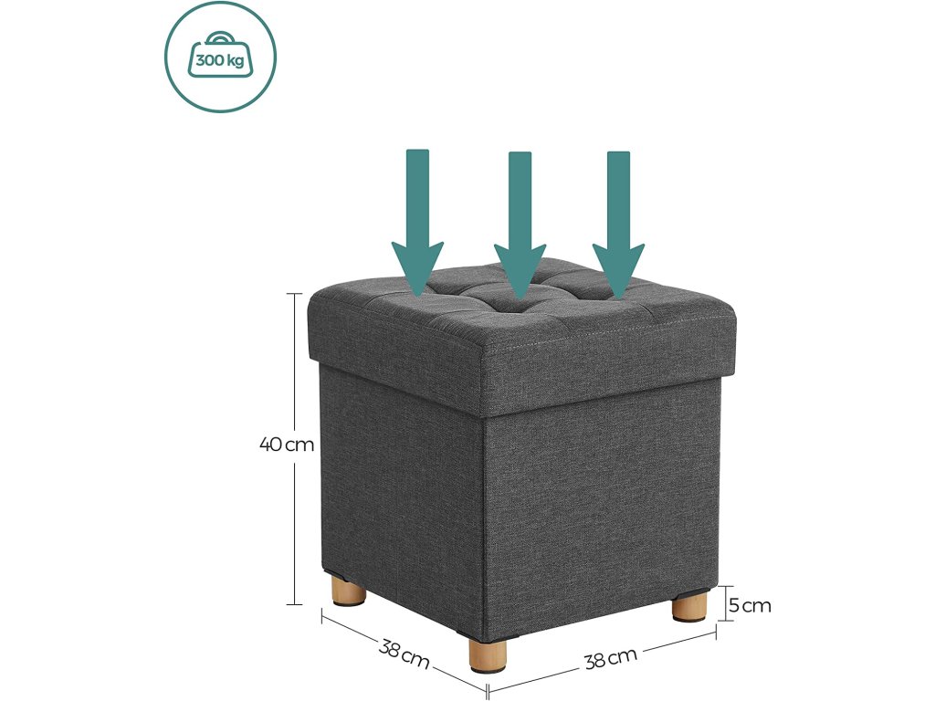 Taburet Thea s úložným priestorom, Tmavo sivá Taburet, sedacia stolička, skladacia sedacia truhla, polstrovaná, s vekom, nohy z masívneho dreva, šetrí miesto, nosnosť až 300 kg, do obývacej izby.